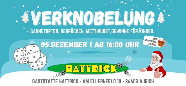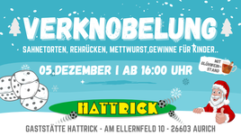 Am 5. Dezember ab 16:00 Uhr laden wir euch herzlich zur Verknobelung in die Gaststätte Hattrick ein (Am Ellernfeld 10, 26603 Aurich) Gewinnt leckere Sahnetorten, Mettwürste, tolle Preise...