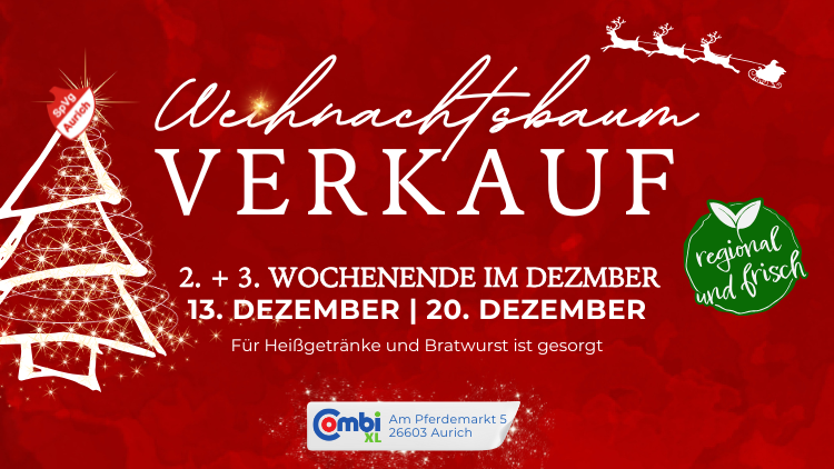 Auch in diesem Jahr bieten wir wieder frisch geschlagene Weihnachtsbäume aus der Region (Ihlow) beim Combi XL in Aurich an. Der Verkauf findet an den folgenden Terminen statt: